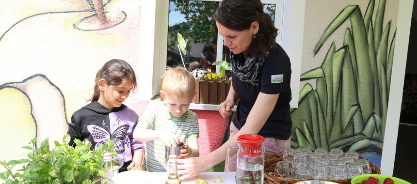 An vier Stationen konnten die Kinder anschließend selbst aktiv werden. Sie säten Getreide und Gemüse wie Hafer, Radieschen und Möhren aus und lernten, dass gesunde Ernährung bereits bei Anbau und Einkauf beginnt. In der Küche bereiteten sie Haferwaffeln mit verstecktem Gemüse zu, mahlten Vollkornmehl und gestalteten kreative Gemüselollies und Möhrchen-Blumen und lernten den Unterschied und Mehrwert von Weißmehl und selbstgemahlenem Vollkornmehl. Für Bewegung sorgte ein Parcours im Freien, bei dem sich die Kinder richtig austoben konnten. Denn nicht nur ausgewogene Ernährung sondern auch Bewegung ist für eine gesunde Entwicklung wichtig.