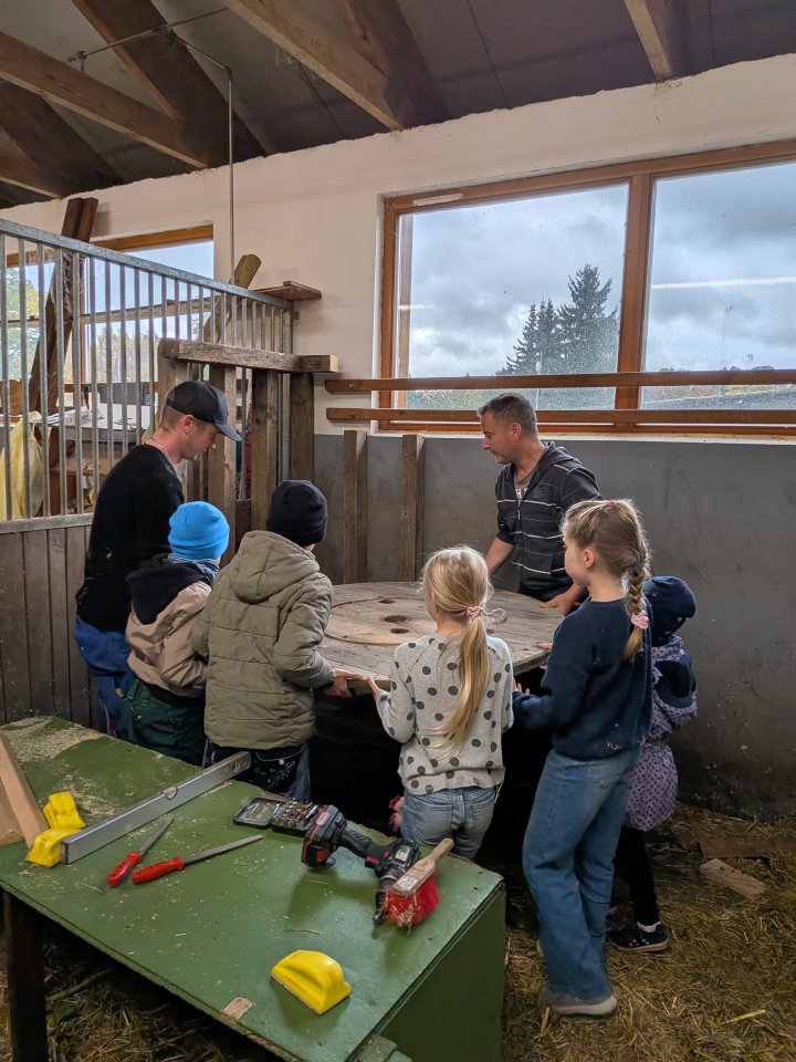 Natürlich darf das Kürbisschnitzen in der Herbstzeit nicht fehlen. Auch daran konnten sich die Kinder und Jugendlichen ausprobieren. Besondere Exemplare, die den Balkon, Garten oder die Fensterbank an den Abenden schmücken, entstanden dabei. Handwerklich wurde es auch am letzten Ferientag. Denn da nahmen sich die Kinder und Mitarbeiter der Kinder- und Jugendfarm etwas ganz Besonderes vor. Sie gestalteten einen „Indoorspielplatz“ für die Kaninchen und Meerschweinchen im Auslaufgehege. Hierzu wurden Paletten, Bretter oder Holzscheiben mit Nägeln und Schrauben zu einem sehr einladenden Kletterbaum zusammengefügt. Hoch hinaus geht es wohl nun für Kaninchen und Co auf ihrem neuen „Indoorspielplatz“.