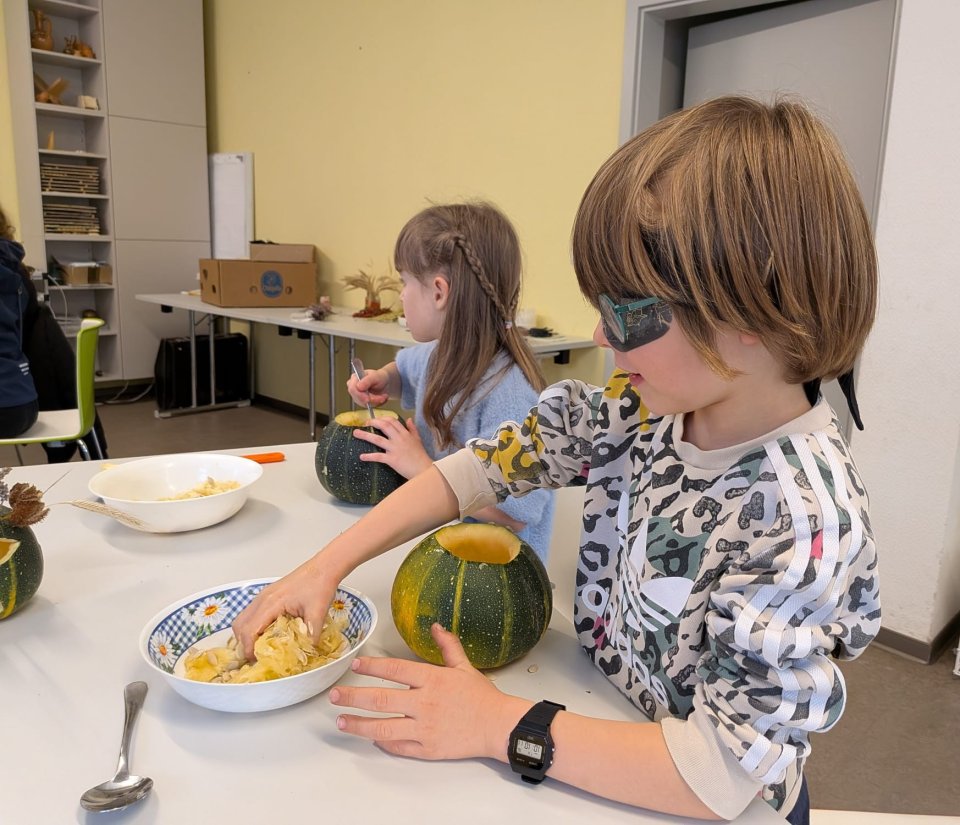 Die zweite Woche begann etwas besinnlicher. Die dunkle Jahreszeit lädt wieder zum „Lichteln“ ein, und so wurden kleine Herbstlichter und Lampions individuell gestaltet – denn der Martinstag rückt immer näher. Die Wintervögel können schon jetzt im Herbst mit Futterhilfen in der Nahrungssuche unterstützt werden. Doch welche Körner, Nüsse und Samen mögen die Vögel unserer Region? Das und vieles mehr erfuhren die Kinder beim Bauen und Befüllen der Futterhilfen.