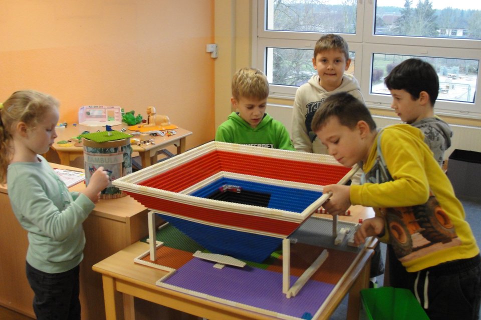 Im Hort ist es oft das leise Klicken der bunten Legosteine, das konzentriertes Arbeiten ankündigt. Was auf den ersten Blick wie freies Spielen wirkt, hat einen großen pädagogischen Wert: Das Bauen und Konstruieren mit Lego fördert bei Kindern sowohl die Kreativität als auch das logische Denken. Speziell dafür wurde im Hort eine große bunte Legoplatte vertikal an der Wand befestigt.