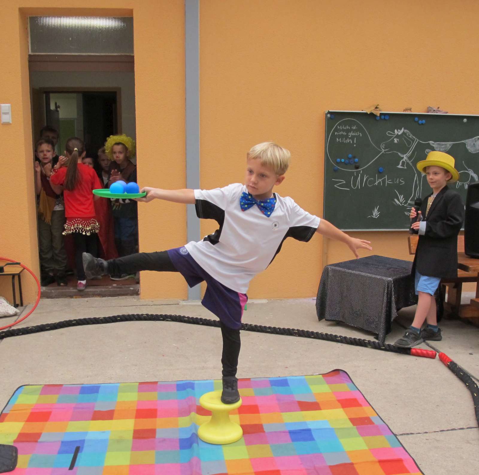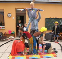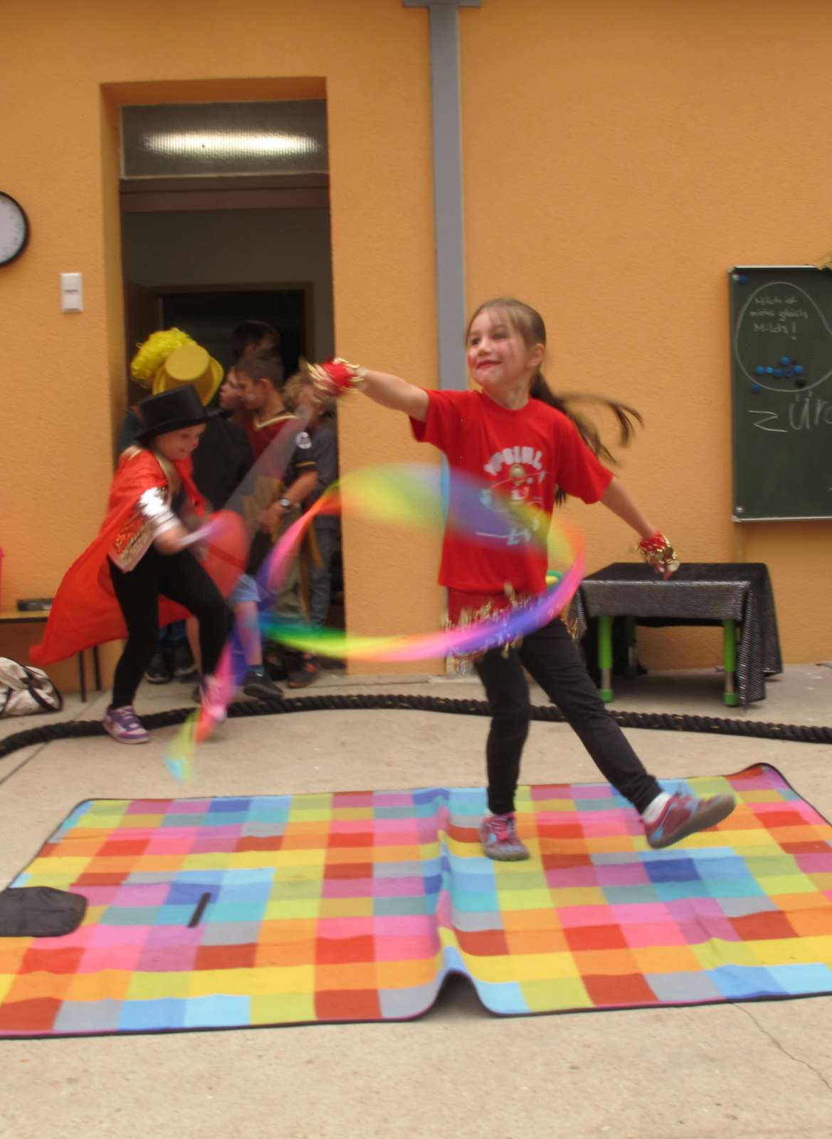 Mit großer Begeisterung wurde geprobt und bei der finalen Zirkusvorstellung hatten alle jede Menge Spaß – nicht nur die Zuschauer! Direktor Lukas führte durch das Programm, die Clowns Flopsi und Mopsi alias Adrian und Nero brachten alle zum Lachen, die Artisten Paula und Karl führten Kunststücke vor, Zauberin Hanni zauberte ein Einhorn in den Hut, die Akrobaten Jonas und Elias zeigten Hebeübungen und Dompteur Filip war mit seinem Löwen dabei.