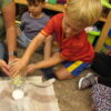 Unsere 5jährige Hanni brachte eine Forscheridee zum Thema Wasser mit. Wie wandert das Wasser von einem Becher in den anderen? Sie erläuterte es den Kindern ganz genau: mit einer gefalteten Brücke aus Küchenkrepp. Interessiert sahen die Kinder zu, wie sich der Zellstoff vollsog. In den nächsten Tagen war die Hälfte des Wassers von einem Becher in den anderen hinüber geflossen.
