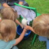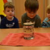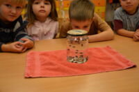 Im zweiten Teil des Angebotes bauten die Kinder einen Wasserfilter. Gemeinsam sammelten sie Sand und Kieselsteine im Garten. Anschließend schichteten die Kinder nacheinander Zellstoffpapier, gesiebten Sand, Kieselsteine, Holzkohle und Moos in eine große PET-Flasche. Dann wurde schmutziges Wasser zugegeben und kaum zu glauben, es kam sauberes Wasser unten raus.