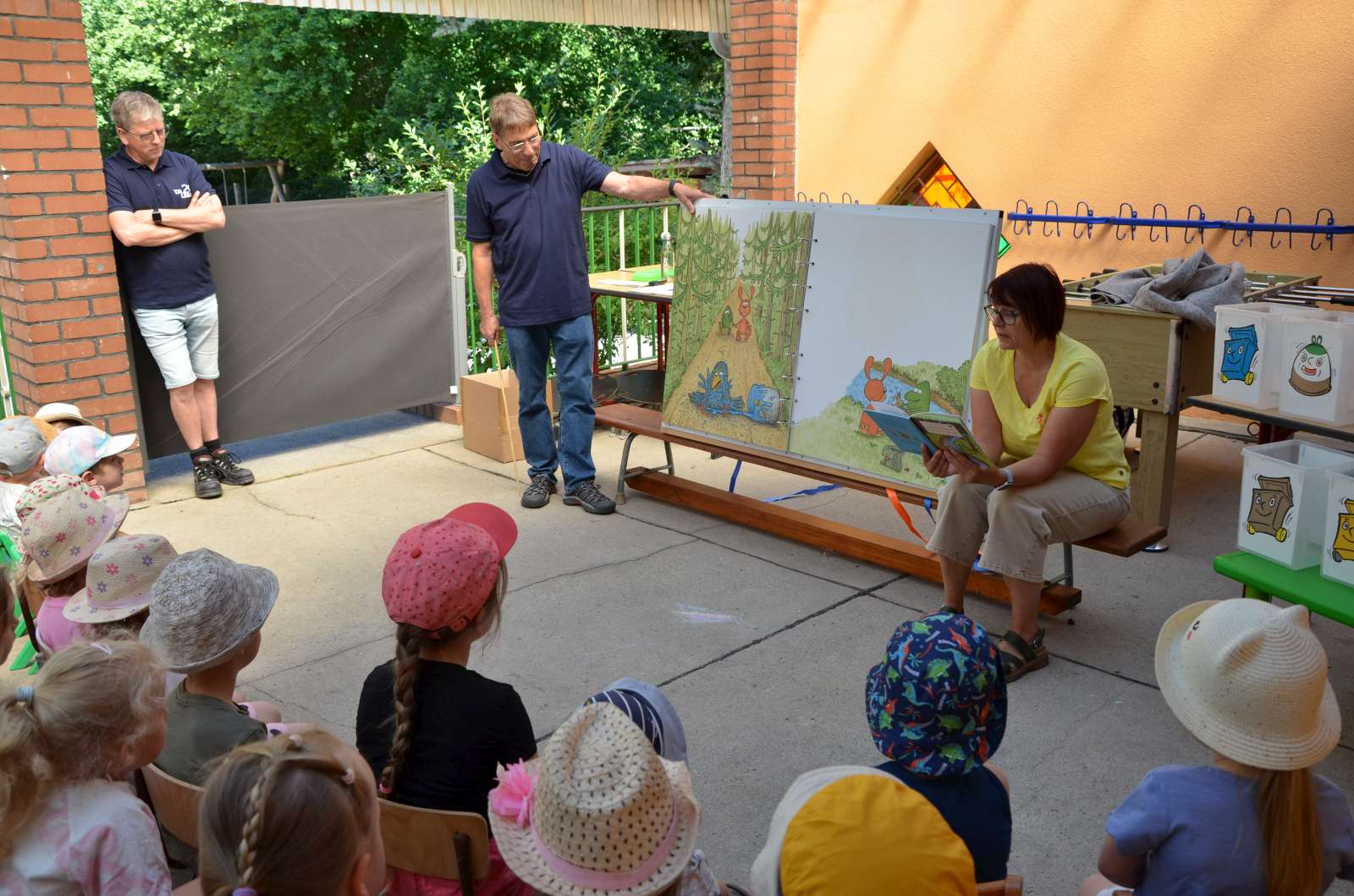 …dieses Kinderbuch von Mathias Sodtke brachten die beiden Mitarbeiter der „T.A. Lauta" in einer XXL Ausgabe mit. Bernd Schnabel und Timo Weist besuchten unsere Kita am Dienstag, den 2.Juli 2025, und wurden von uns musikalisch mit dem „Mülllied“ begrüßt.