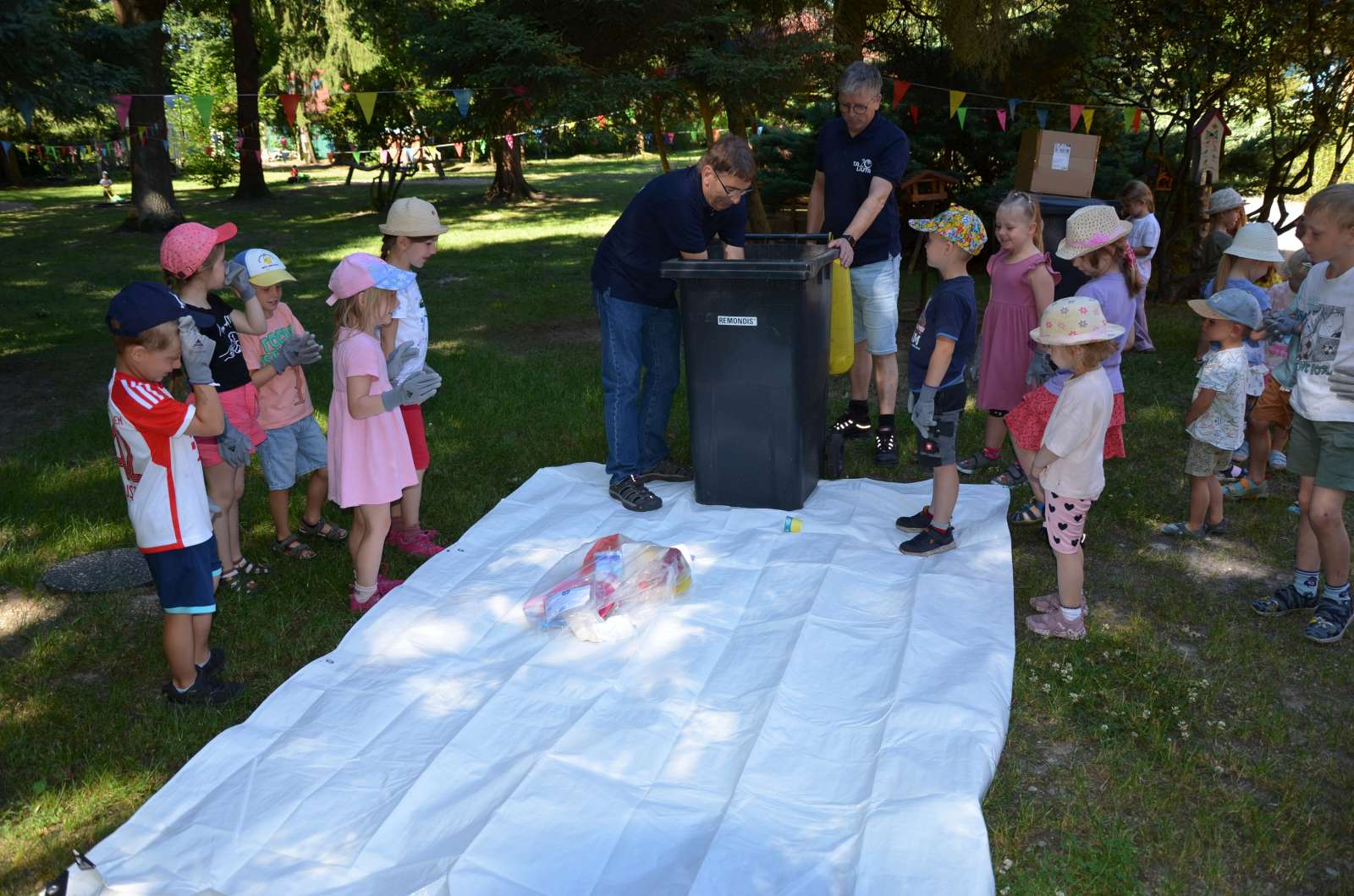 Frau Mayenberg-Zagorski versteckte jede Menge Müll, ob Pappe, Papier, Plastik, Glas oder Essen. Die Kinder durften es suchen und mit Greifzangen und Handschuhen aufsammeln. Dann saßen sie zusammen und trennten den Müll voneinander.