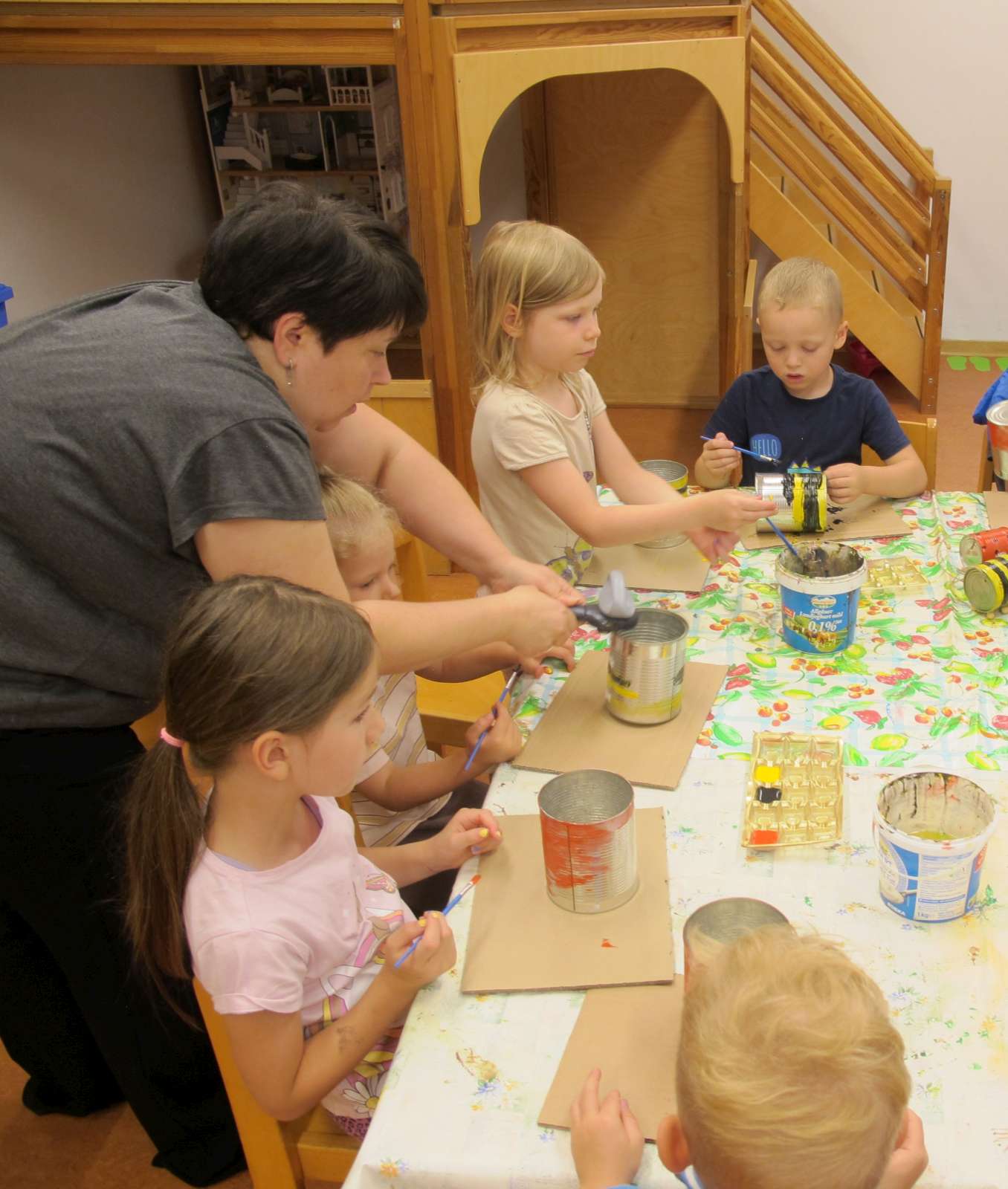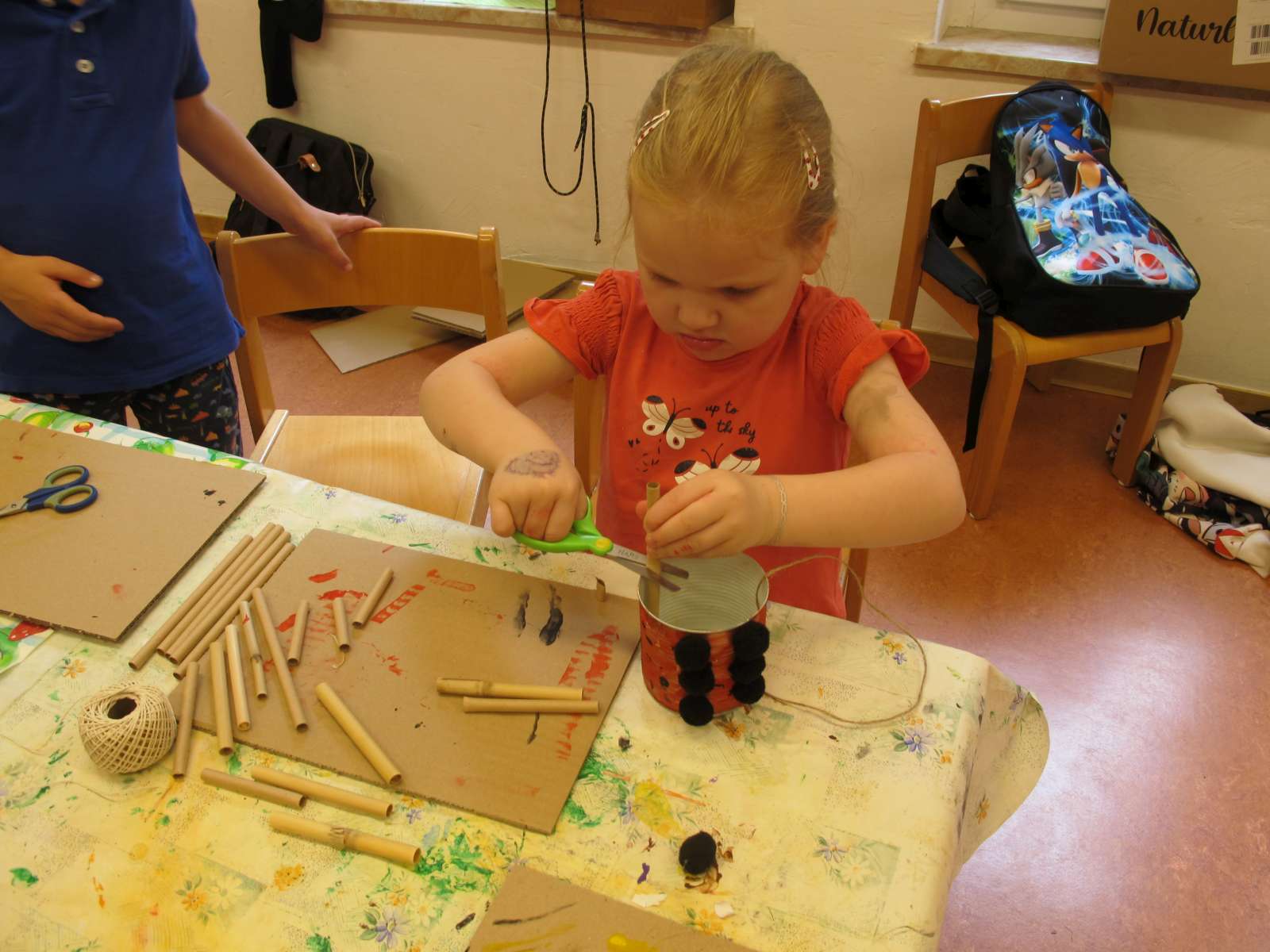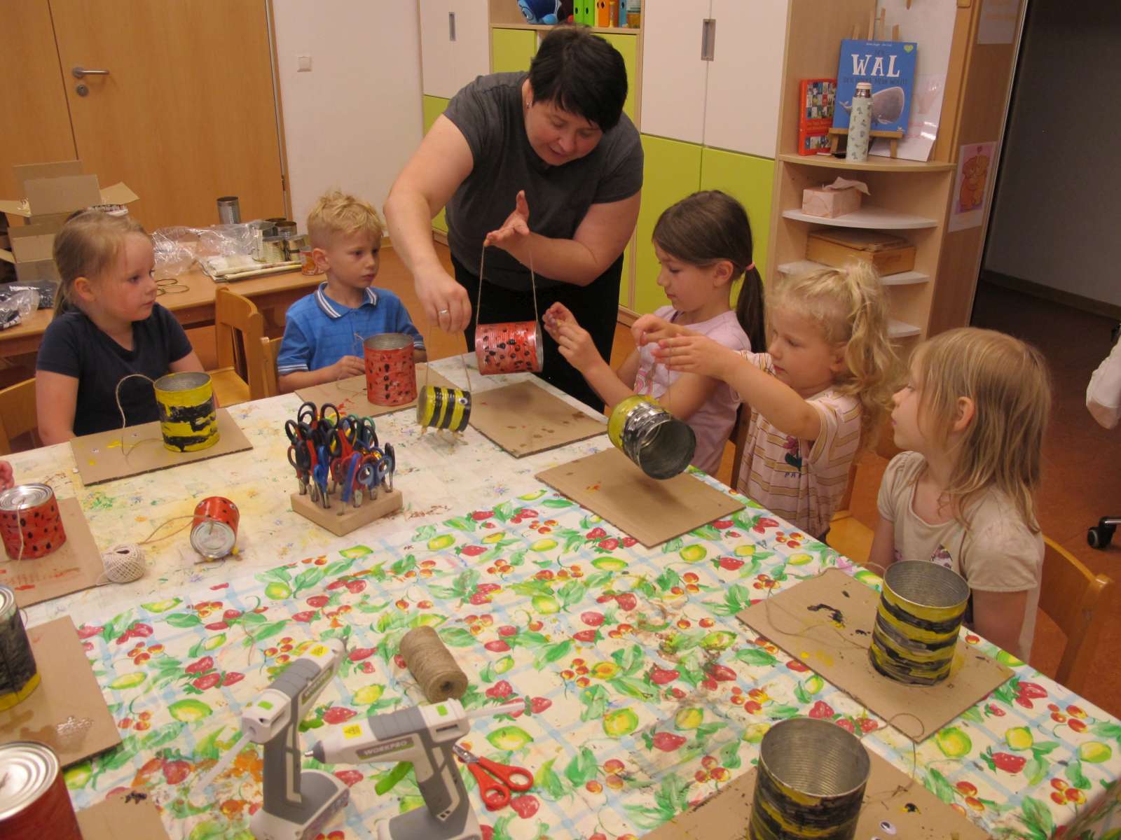 Am Dienstag, dem 8. Juli 2025, durften wir uns über ein tolles Kreativangebot von Katrin Klein und Anika Noack vom MGH Bernsdorf freuen. Und das passte sogar perfekt zu unserem aktuellen Müllprojekt: Aus leeren Obstbüchsen, die das „Eiscafé Steger“ extra für uns gesammelt hat, bastelten die Kinder fantasievolle Insektenhotels!