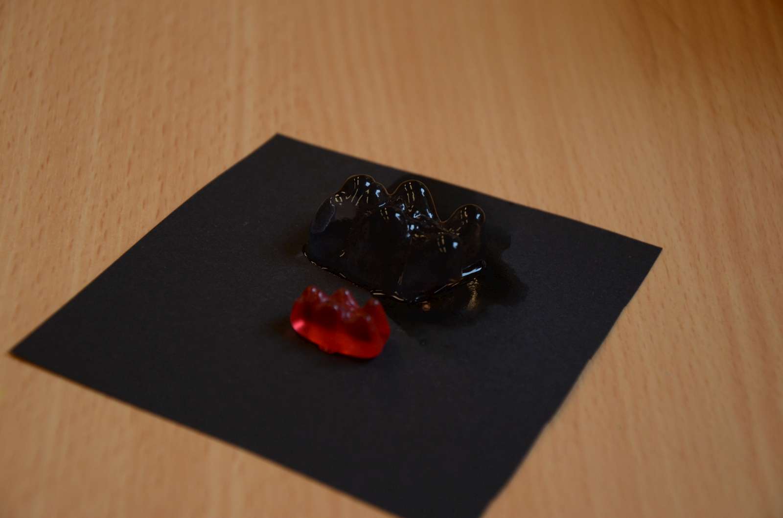 Gummibärchen verschwanden wie von Zauberhand im warmen Wasser oder wurden dicker im kalten Wasser. Auf einmal war das Gummibärchen farblos und fühlte sich richtig glitschig an.