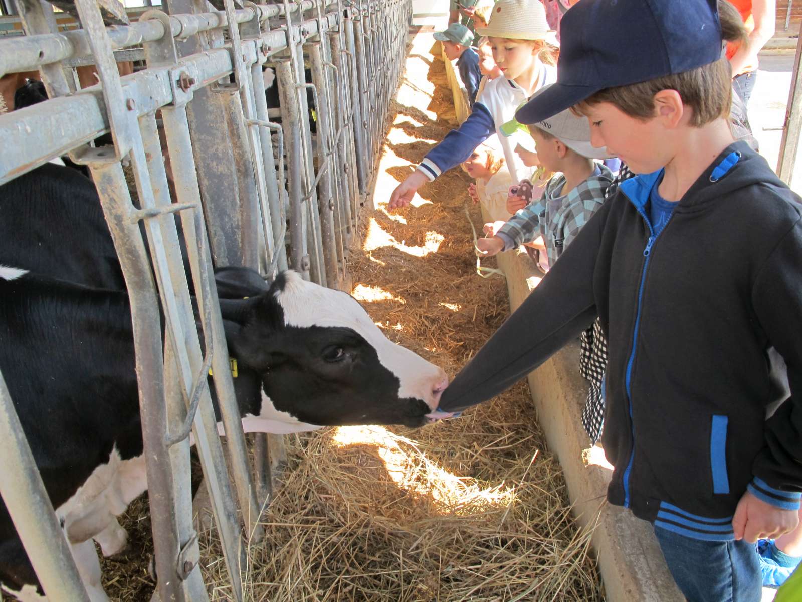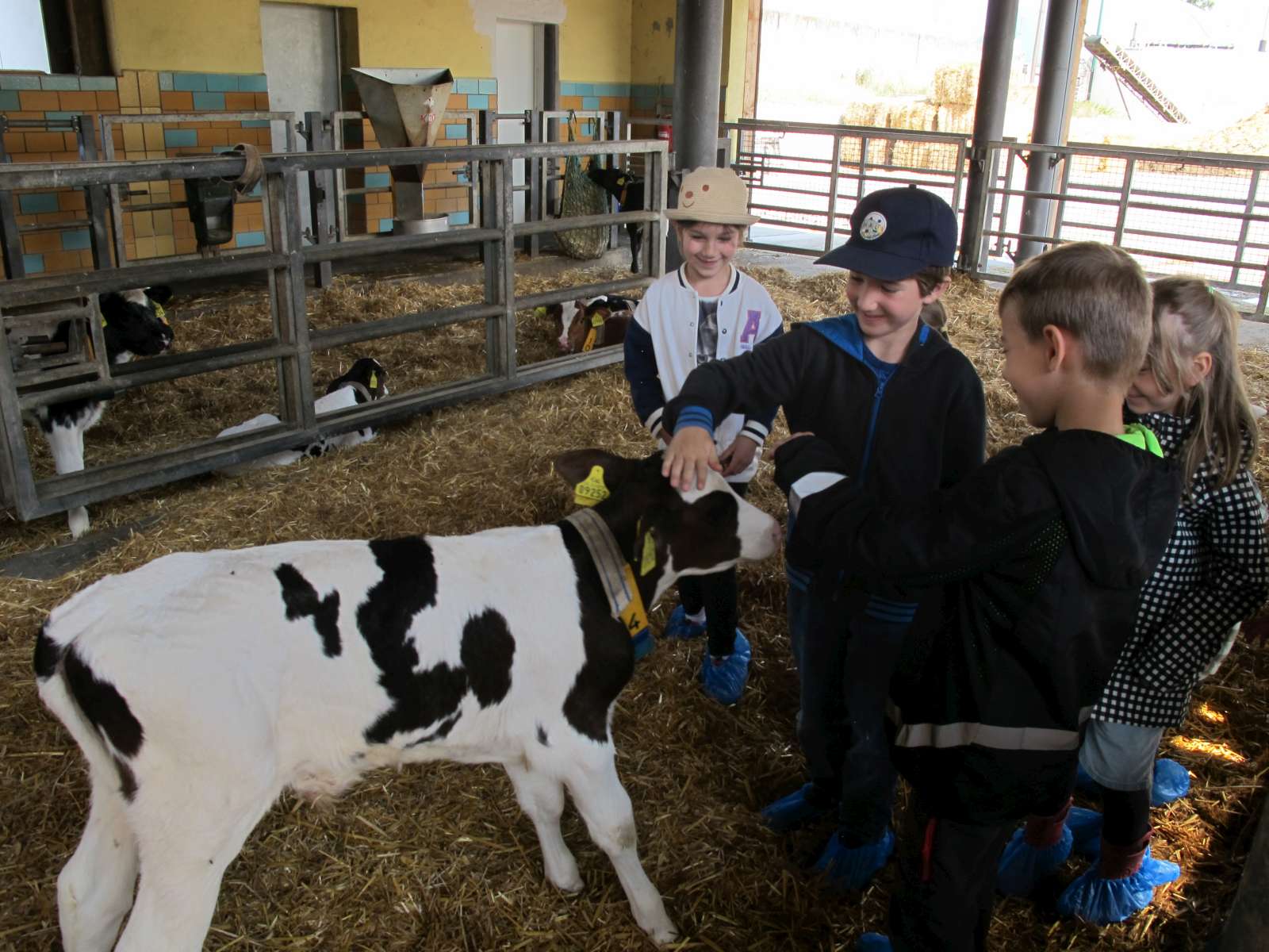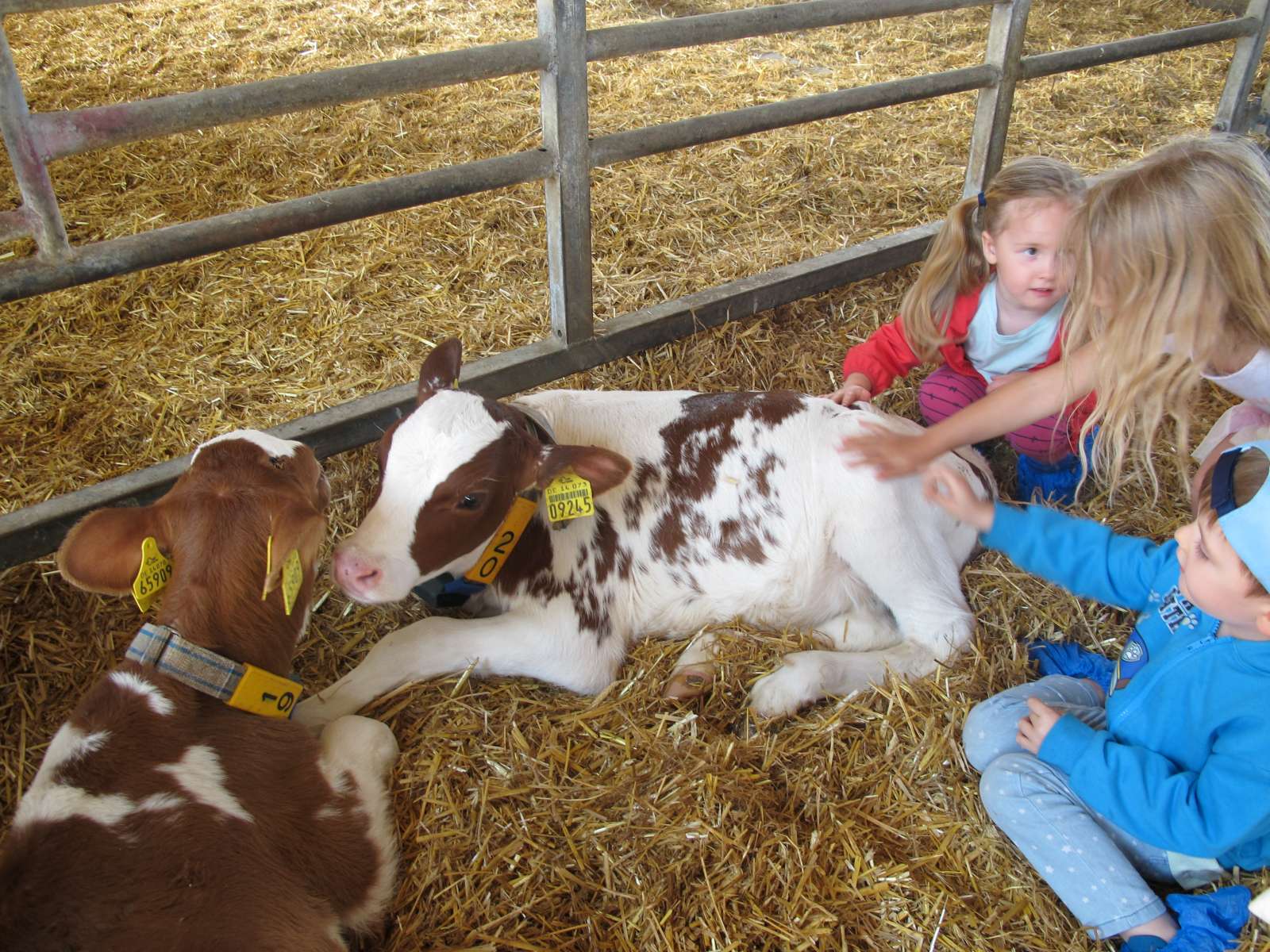Danach durften wir auf Entdeckungsreise durch die Stallungen gehen. Besonders die kleinen Kälbchen hatten es den Kindern angetan: streicheln, fühlen und sogar abschlecken lassen – da wurde viel gelacht und gestaunt!