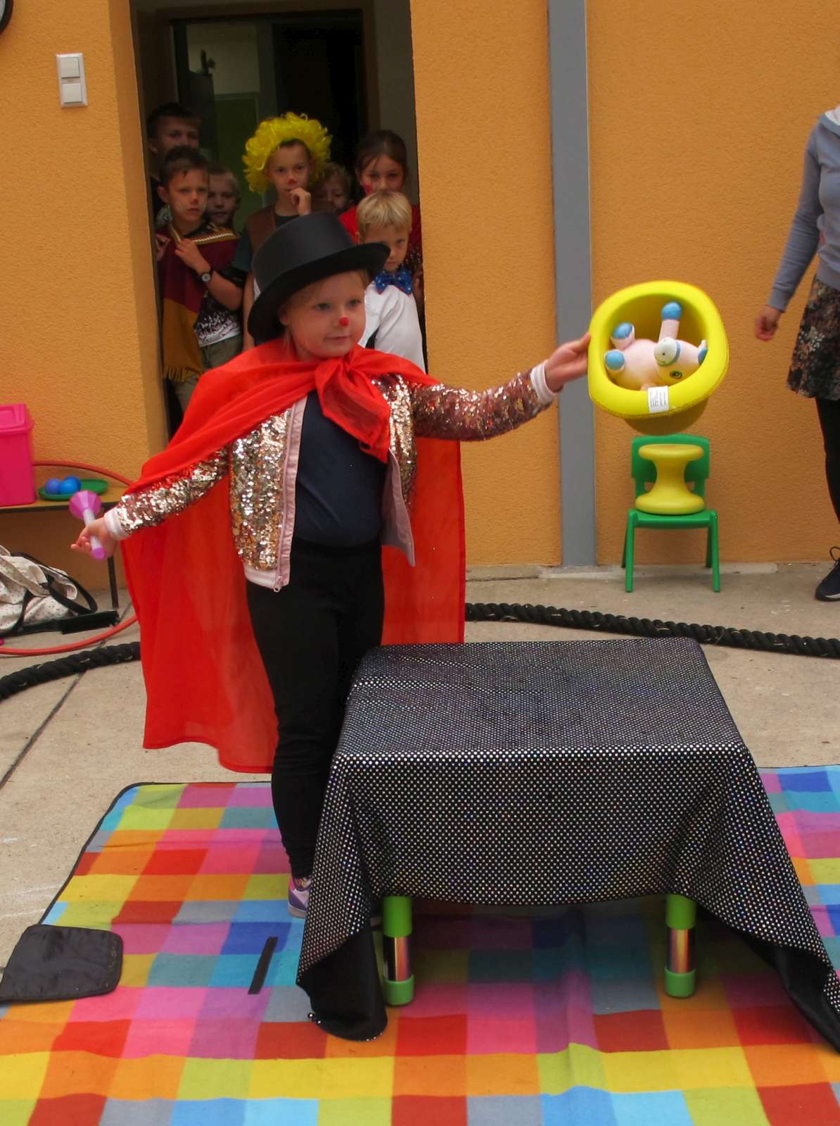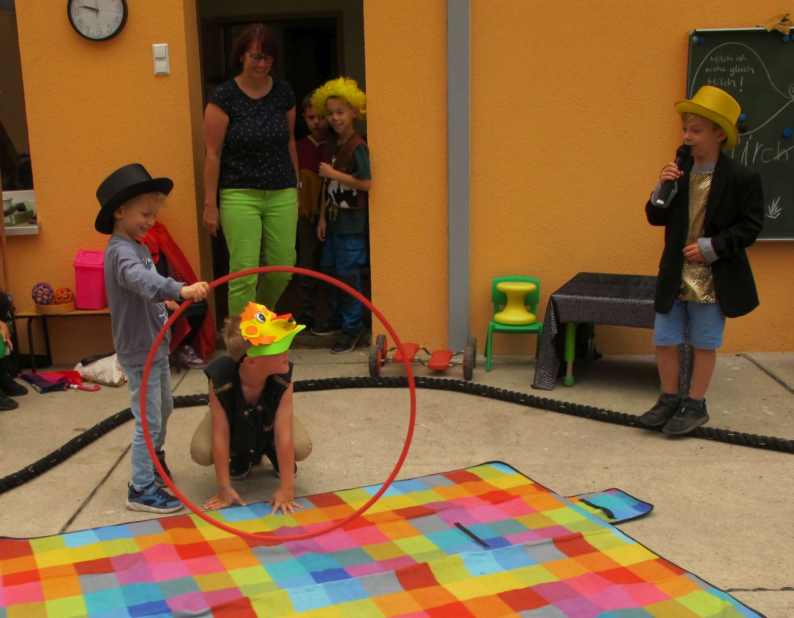 In dieser Woche verwandelte sich unsere Kita in eine bunte Zirkuswelt. Die älteren Kinder hatten die Idee und planten selbstständig eine Vorstellung für die jüngeren. Sie besprachen und verteilten die einzelnen Rollen, entdeckten dabei ihre Stärken und Kreativität. Ganz nebenbei wurde damit die Motorik, das Gemeinschaftsgefühl und ihr Selbstbewusstsein gestärkt.