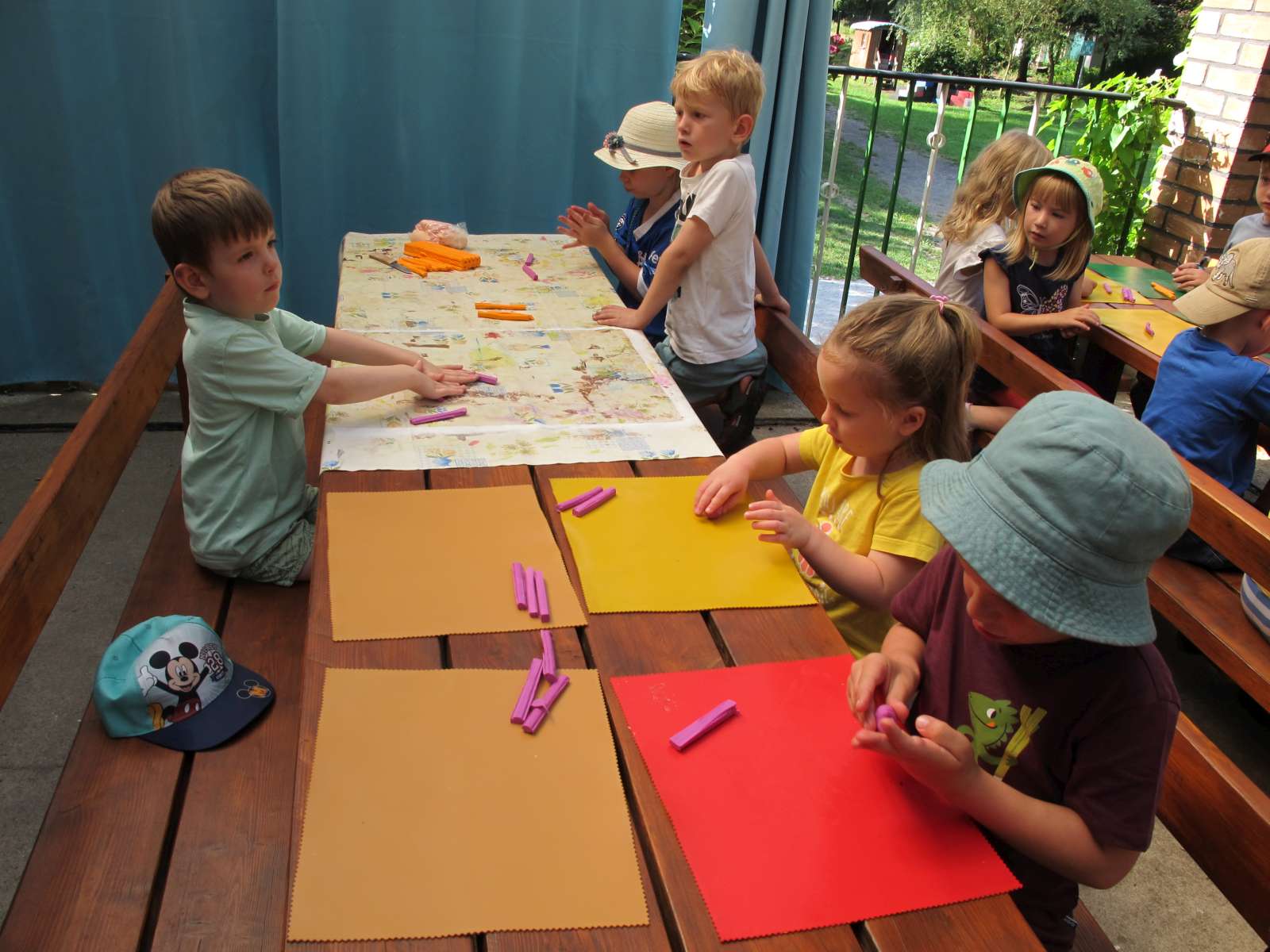 Außerdem waren die älteren Kinder im Bastelfieber. Jeden Tag falteten sie Flugzeuge und testeten, welches am weitesten fliegt. In unserer Kinderwerkstatt stöberten die Hortkinder durch die Regale und entdeckten viele verschiedene Materialien, aus denen sie kreative Fantasiegebilde werkelten, z.B. eine Wellnessoase, ein Schiff oder ein Floß.
