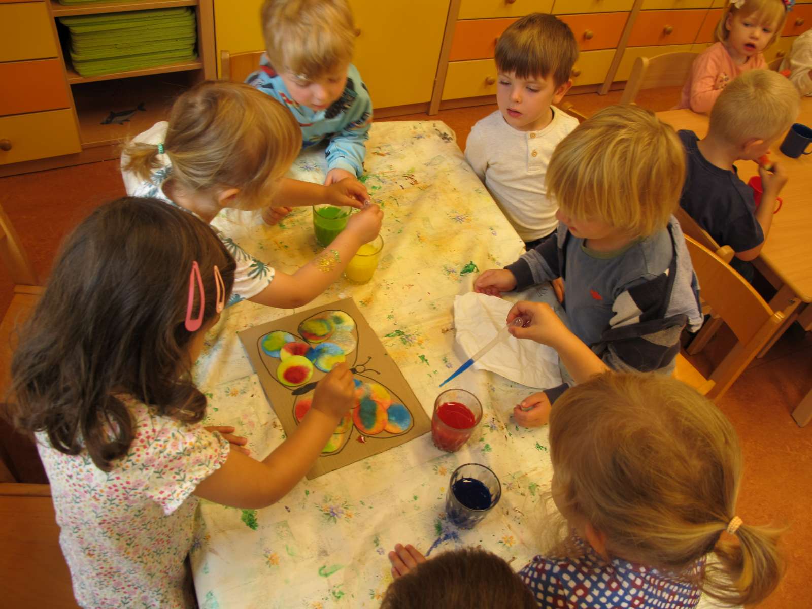 In der Forscherwerkstatt experimentierten die Kinder mit Primärfarben und mischten diese mithilfe von Pipetten. So fanden sie heraus, welche Primärfarben neue Sekundärfarben ergeben und dabei entstanden wunderschön leuchtete Flügelmuster.