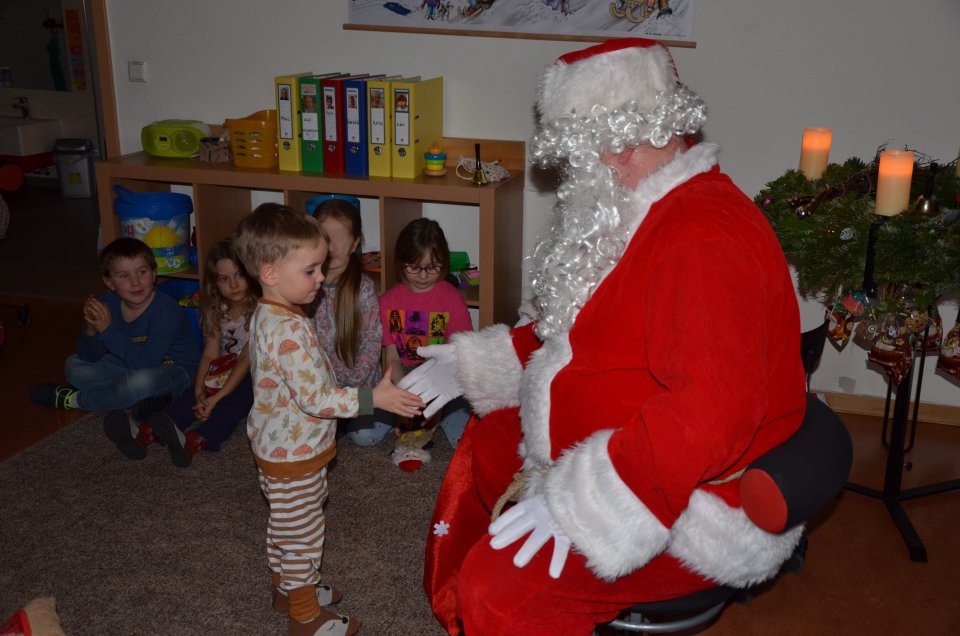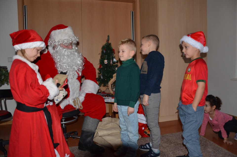 Am 9.Dezember 2025 bekamen wir wieder Besuch vom Weihnachtsmann. In diesem Jahr wurde eine Weihnachtsfrau als Gehilfin gewählt - Charlotte half ihm beim Geschenke verteilen. Gemeinsam mit ihrem Bruder sang sie dann auch ein wunderschönes Engelslied und beide ernteten großen Applaus. Auch unsere Hortjungs sangen ein Weihnachtslied.