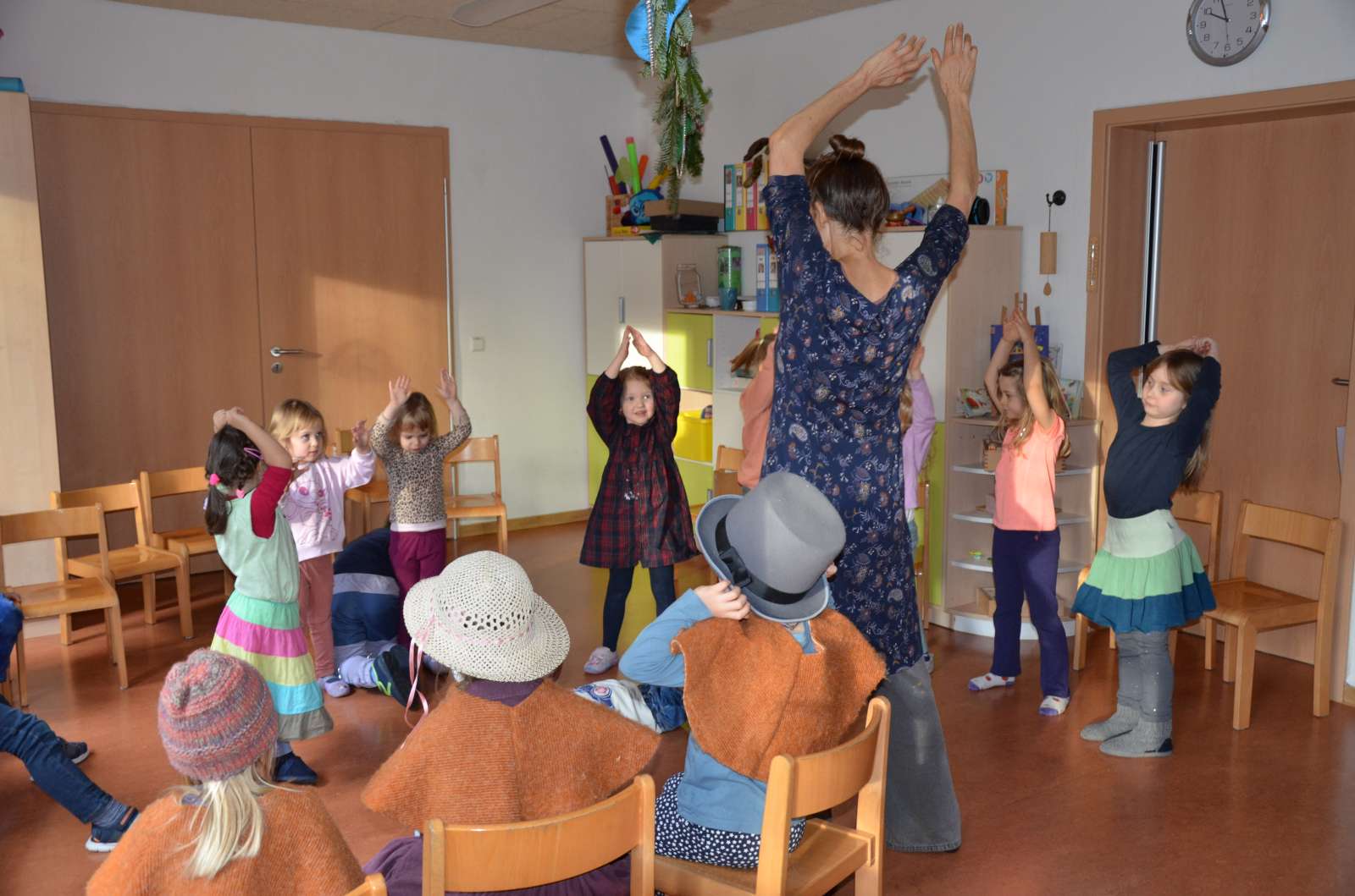 Und natürlich kam auch die Bewegung nicht zu kurz. Bei Schmetterlingstänzen mit Schwungtüchern und bei sportlichen Übungen, z.B. wie eine Raupe kriechen oder sich in einen Kokon einrollen, hatten die Kinder viel Spaß.