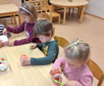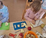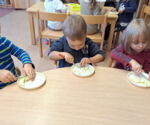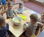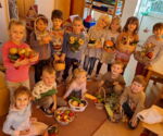 In den Erntedank-Körbchen, welche die Kinder mitgebracht hatten, war ausreichend buntes Gemüse für eine leckere Nudelsoße. Die Mädchen und Jungen der Lutki Gruppe bereiteten die Soße vor, die Kinder der Kubołčiki Gruppe waren für das Birnenkompott zuständig.