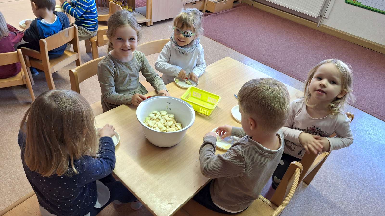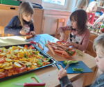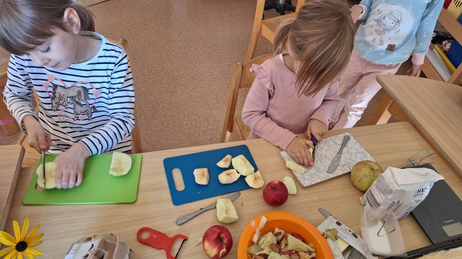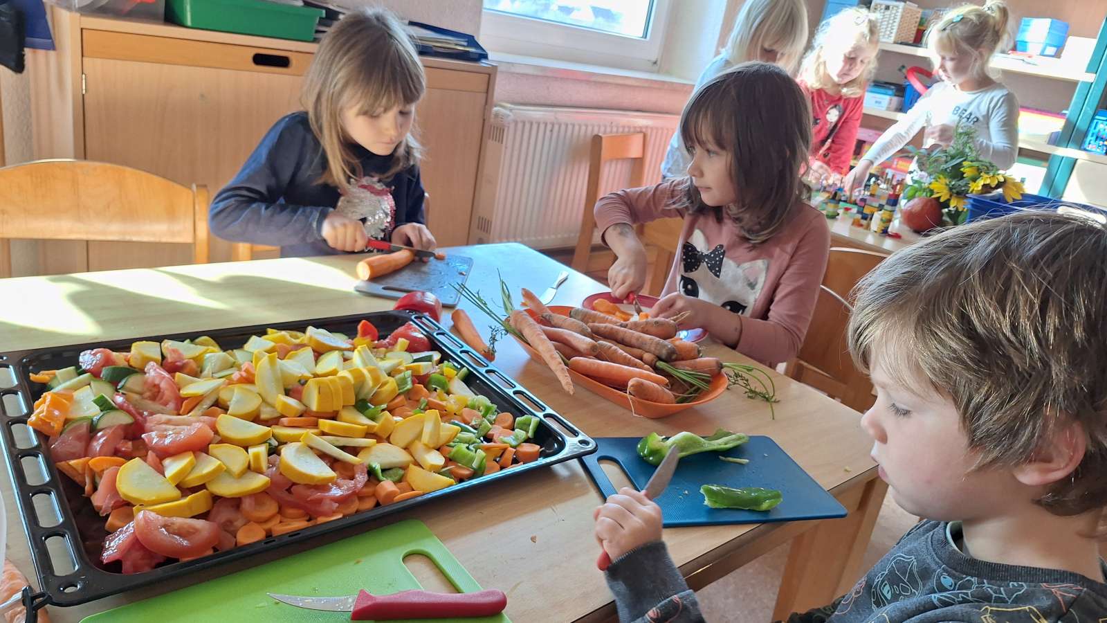 Zelenina za jušku bjerješe so z korbow dźěći. Skupina lutki přihotowaše jušku. Dźěći kubołčikoweje skupiny běchu za krušwiny kompot zamołwite.