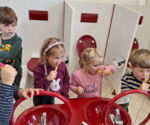 Nachdem ein Kind erfolgreich bei der Zentrale der Feuerwehr angerufen hatte, ertönte schon bald die Sirene und der Wagen rollte mit Blaulicht an. Das “Feuer” wurde schnell gelöscht und wir konnten in den spaßigen Teil übergehen. Die Kinder wurden in vier Gruppen eingeteilt, um einen Fitnessparcours der Feuerwehr zu absolvieren, sich auf Schnelligkeit anzuziehen und sie sollten mit einem Wasserschlauch Becher abspritzen. Ein Feuerwehrmann erklärte den Kindern Vieles über den Beruf und die Aufgaben der Feuerwehr. Das Highlight war jedoch das Anschauen und die Rundfahrt mit dem Feuerwehrauto.