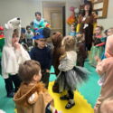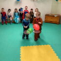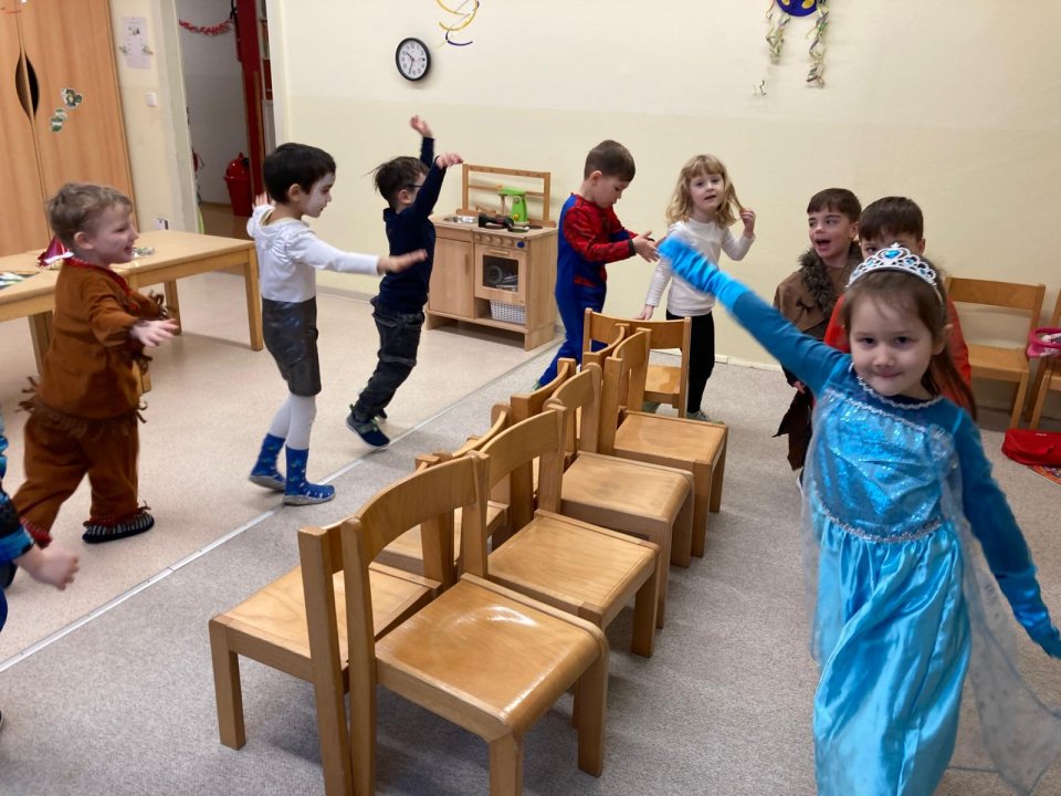 Im Turnraum trafen sich alle Gruppen zum gemeinsamen Tanzen. Bei fröhlicher Musik wurde gehüpft, gedreht, gelacht und ausgelassen gefeiert. Die Kinder hatten große Freude daran, ihre Kostüme zu präsentieren und gemeinsam in Bewegung zu kommen.