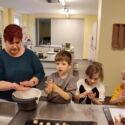 Mit Begeisterung konnten die Kinder erleben, wie das Getreide gesät, geerntet, gedroschen und gemahlen wurde. In kleinen Gruppen durften sie selbst Hand anlegen zum einen bei Saat und Ernte und danach bei der Herstellung von Mehl. Besonders spannend war für die Kinder die Gelegenheit den Teig selbst zu kneten und ihr eigenes Brötchen zu formen und mit verschiedenen Körnern zu dekorieren. Dabei wurden sie von Ernährungswissenschaftlerin Elźbjeta Hoyer unterstützt.