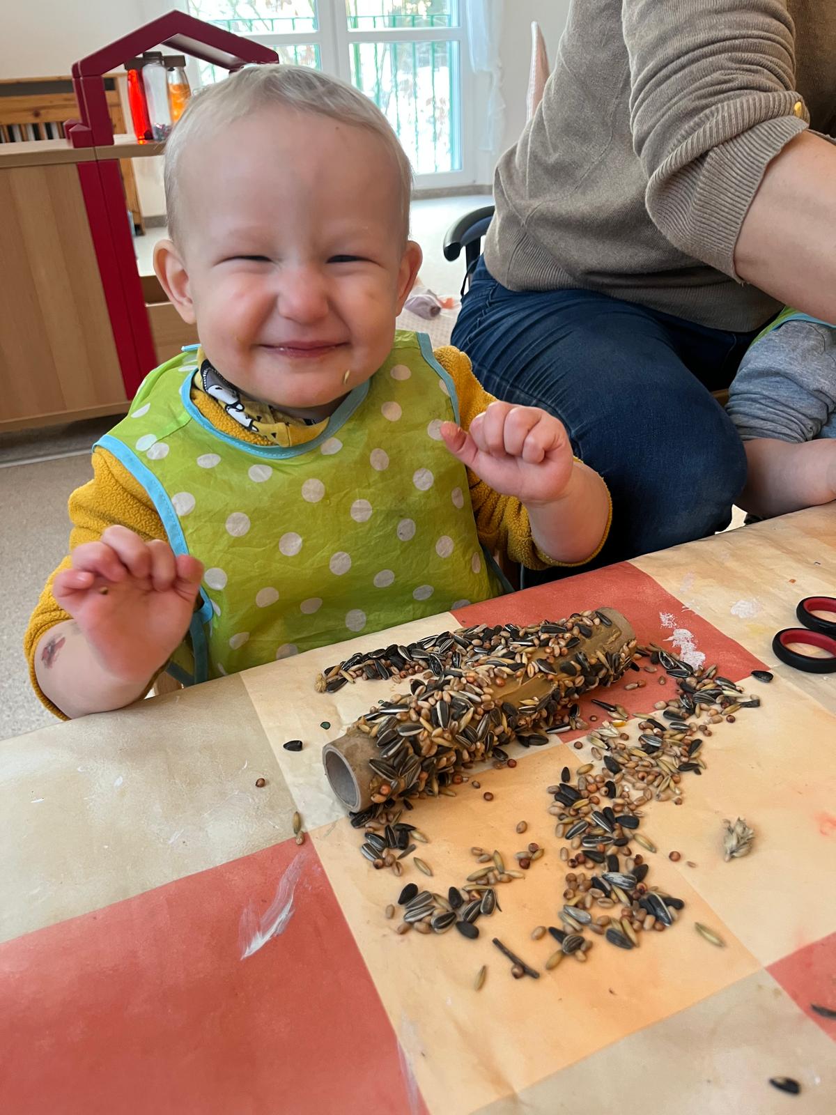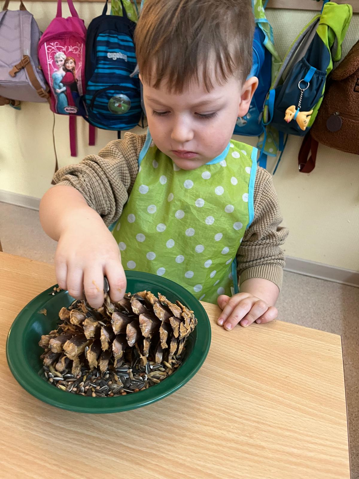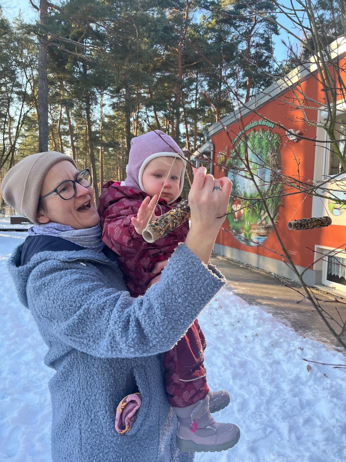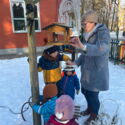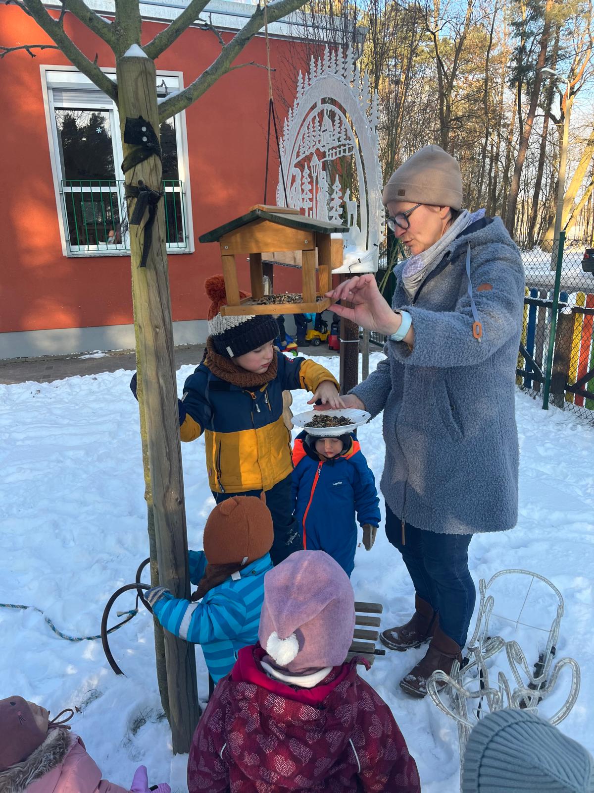 Wie man den Vögeln im Winter helfen kann und welches Futter sie bekommen, wussten auch die Jüngsten schon, denn jede Gruppe hat in unserer Kita ihr eigenes Vogelhaus im Waldgarten. Hier werden sie auch regelmäßig gefüttert.