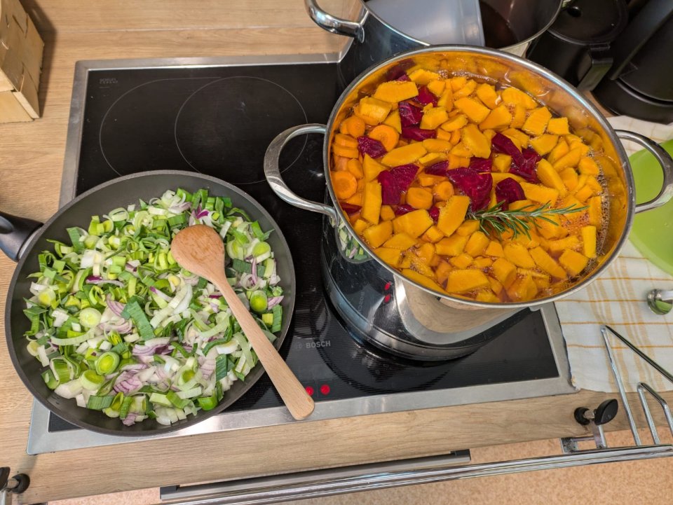 Neben dem Essen standen auch Lieder, Bewegungen und kleine Rituale auf dem Programm: Die Kinder sangen fröhliche Lieder, tanzten gemeinsam und hatten dabei viel Spaß. Herr Fischer organisierte an einem Vormittag eine liebevoll gestaltete Tanzparty. Die Kinder beteiligten sich aktiv, bewegten sich nach Musik – und ganz „nebenbei“ wurde Rhythmusgefühl und Koordination geschult. Ein gesundes Frühstück rundete die Erntewoche ab und gab allen die nötige Kraft für weitere Entdeckungen des Tages. Die Ameisen-Gruppe kochte außerdem eine köstliche Suppe, wodurch Teamarbeit, Kreativität und Freude am gemeinsamen Tun erlebbar wurden.