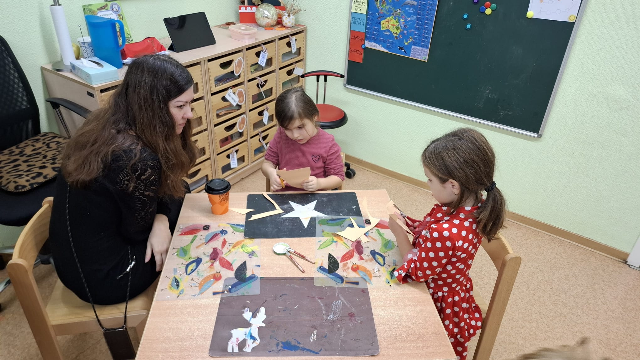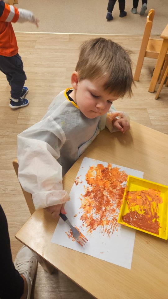 - Fuchs-Gruppe: Die Mädchen und Jungen malen Ende der Aktivität ein Bild des Fuchses, das die Kinder anschließend im Raum präsentieren dürfen. Dadurch fördern wir Kreativität, Feinmotorik und die Beobachtungsgabe