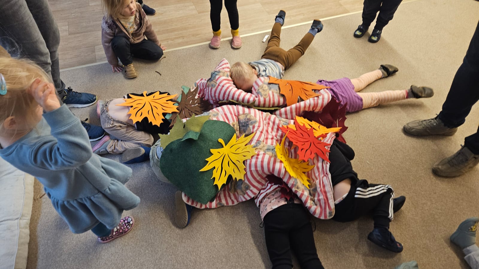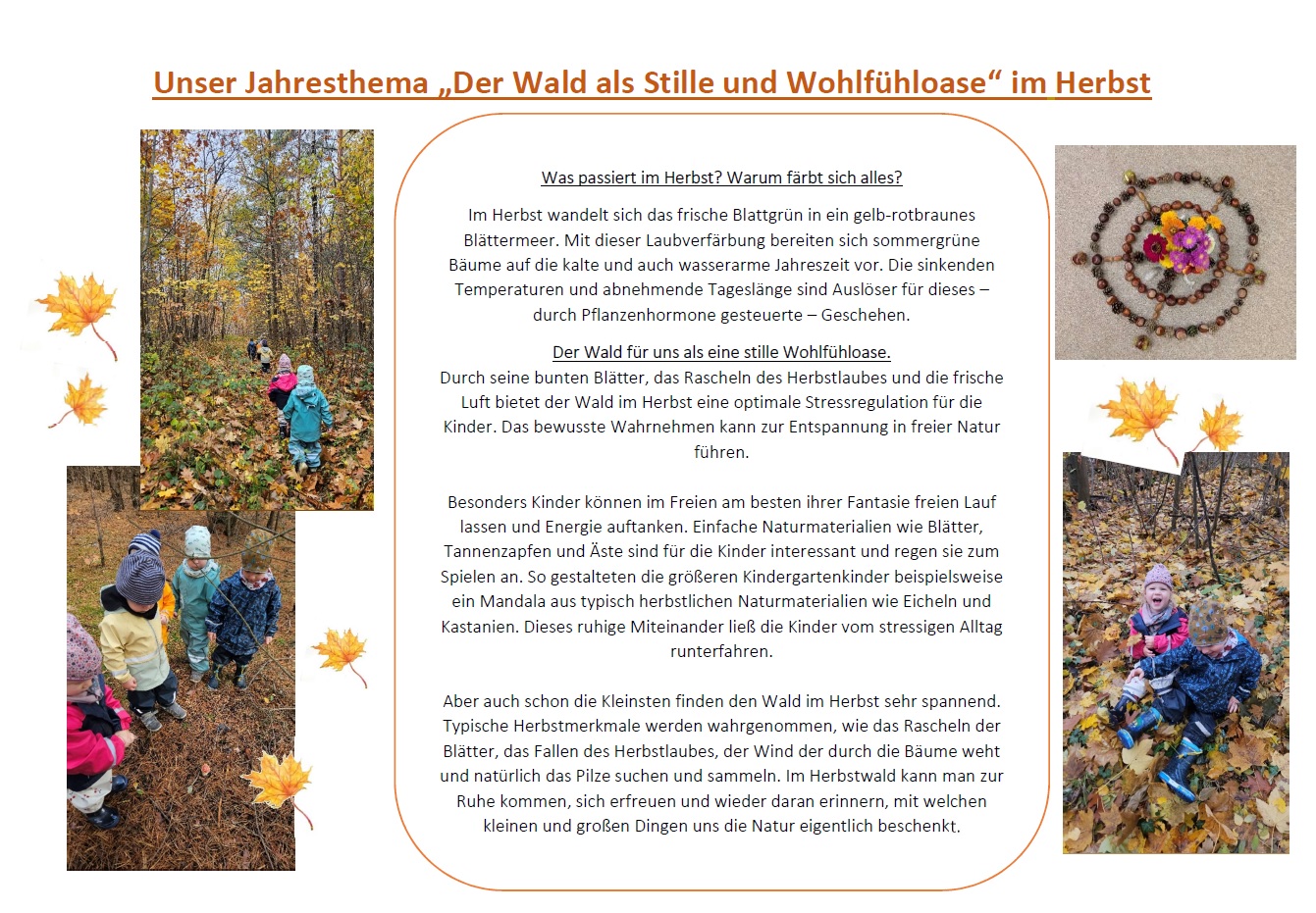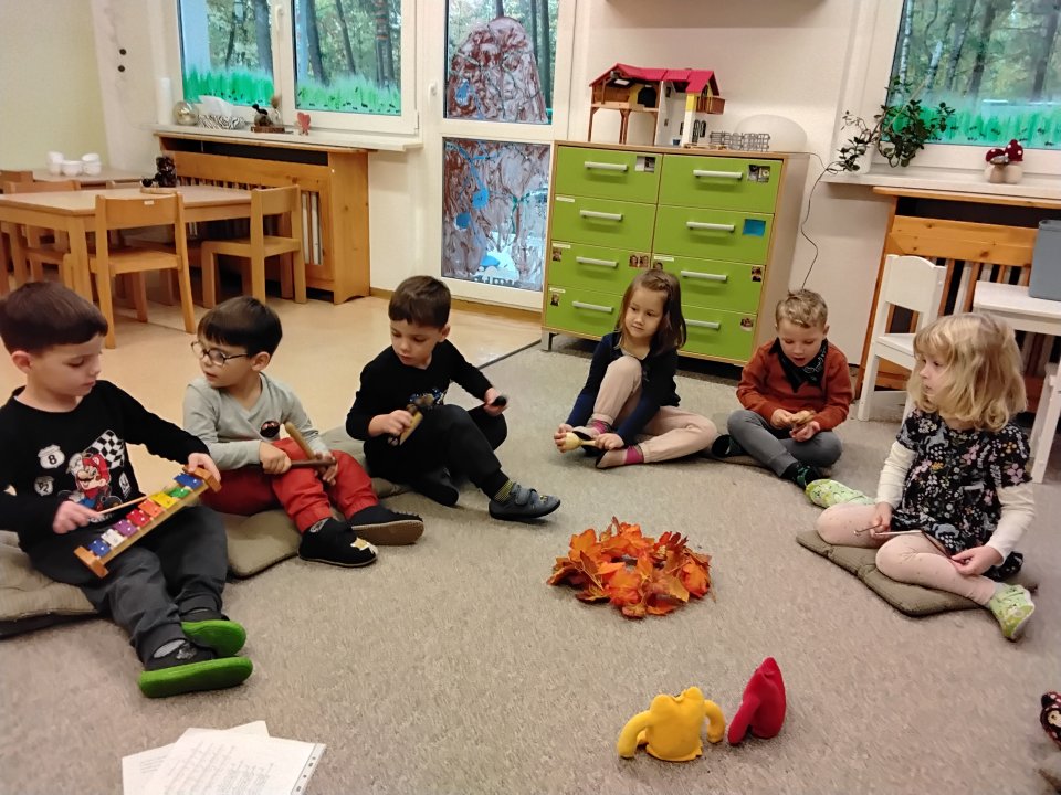- Sinnes- und Bewegungsangebote: Bewegungsparcours, Herbstmaterialien sammeln, Naturspiele im Freien