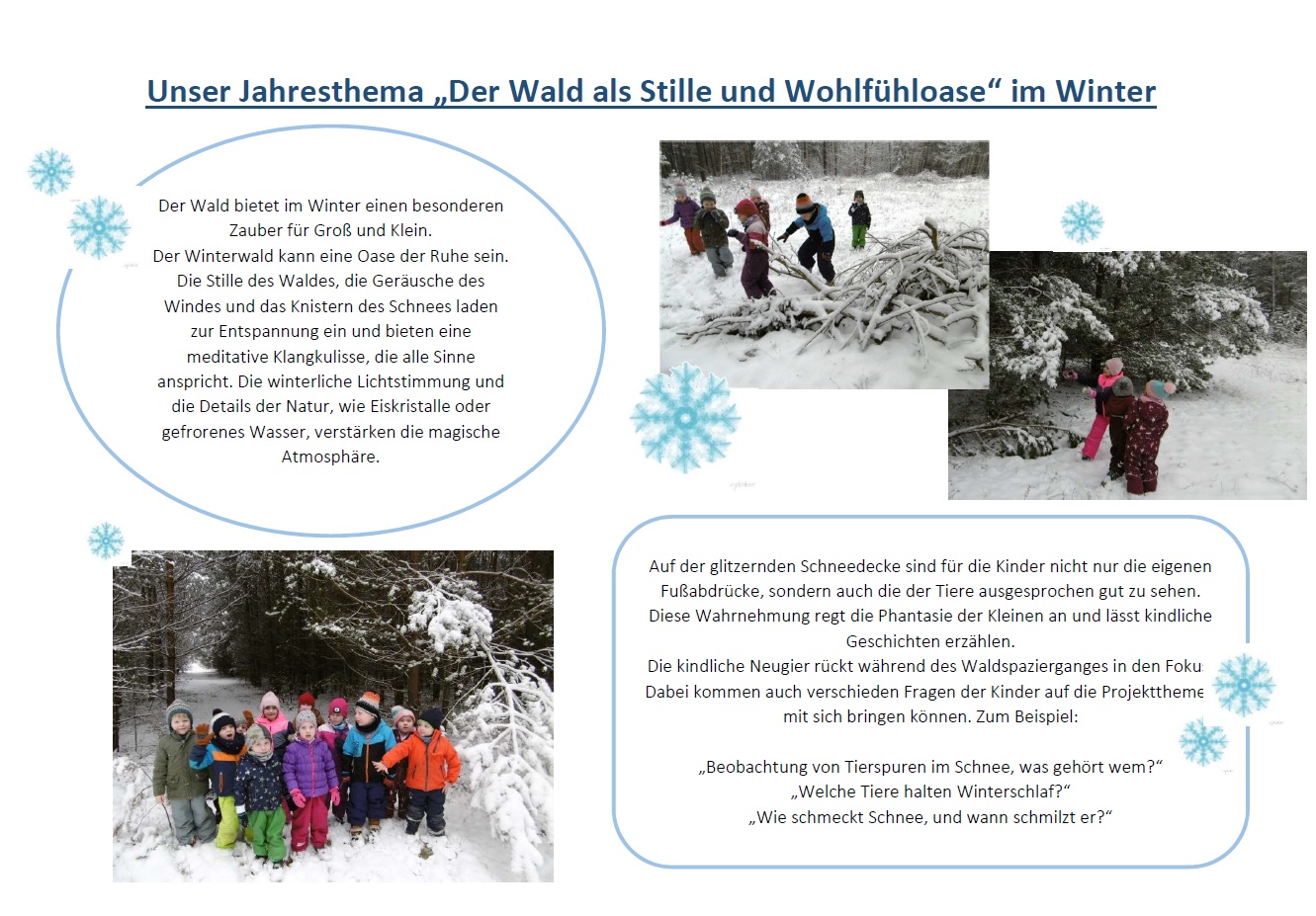 Wenn die Tage kürzer werden und sich der erste Frost zeigt, ist es an der Zeit, den Winter im Kindergarten zu begrüßen. Auch wenn für viele Kinder das Weihnachtsfest der Höhepunkt des Winters ist, bietet die kalte Jahreszeit doch viele weitere Entdeckungen für Groß und Klein: Schnee und Eis, Tiere im Winter, Winterkleidung und andere Themen rund um den Winter wollen erforscht und erkundet werden.