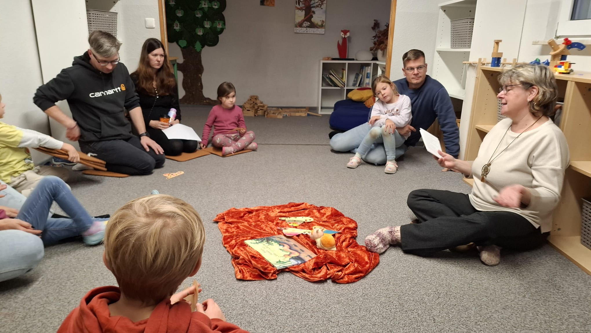 Zu unserem ersten Lesenachmittag in der Kita brachte Astrid Kuhn, Mitarbeiterin der Familienbildungsstätte Bischofswerda, die Geschichte „Das neue Haus für Charlie“ mit. Gemeinsam erarbeiteten Kinder und Eltern der Fuchsgruppe die Aussage der Geschichte. Charlie ist eine Schnecke, deren Haus kaputtgegangen ist und die nun mit der Hilfe anderer ein neues Zuhause bekommt.