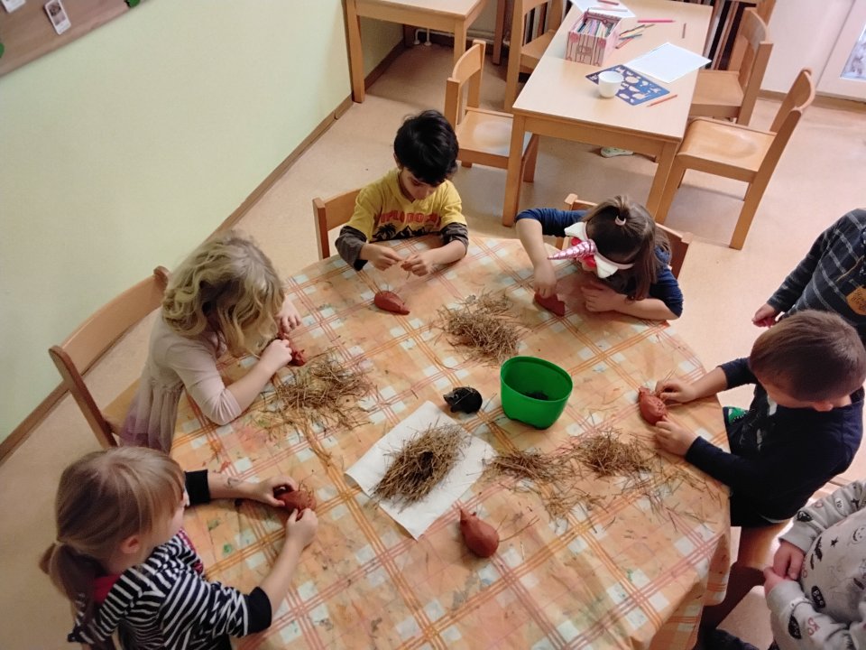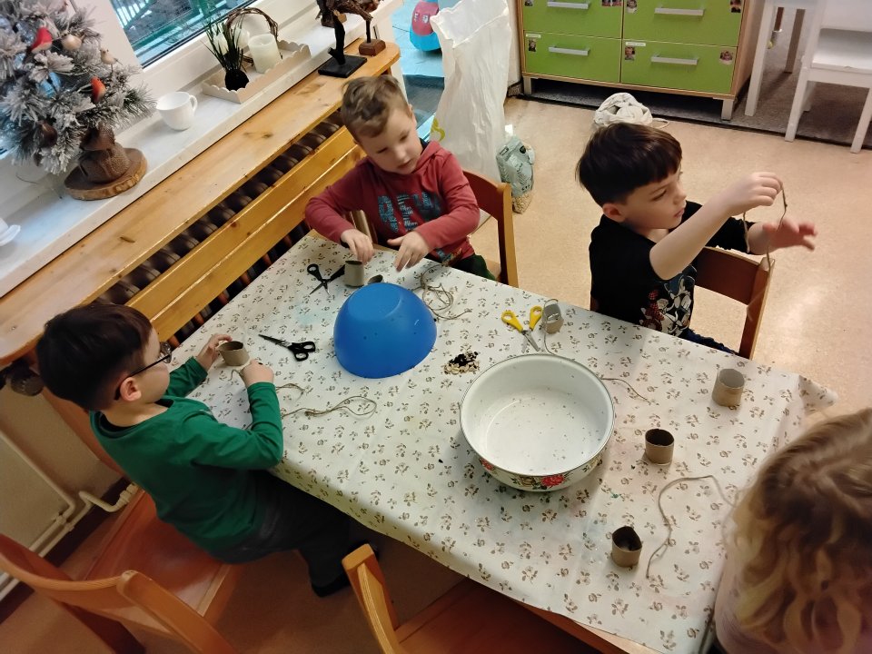 Passend zum Themenschwerpunkt „Vogelhochzeit“ bauten die Kinder Futterhäuser und stellten eigenes Vogelfutter her. In den kommenden Wochen werden sie die Vögel rund um die Kita beobachten und aktiv unterstützen.