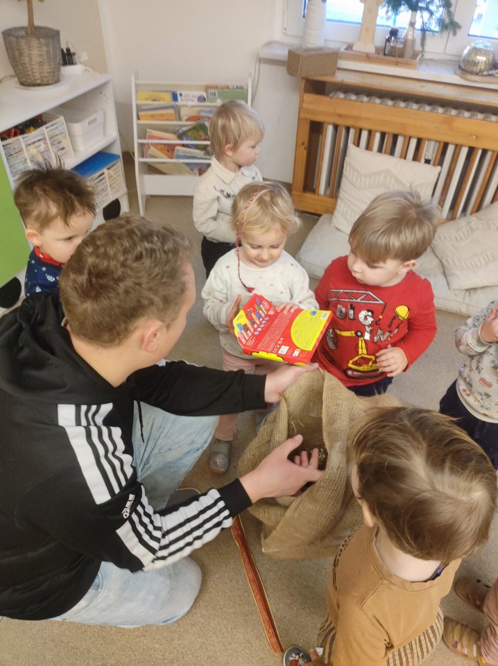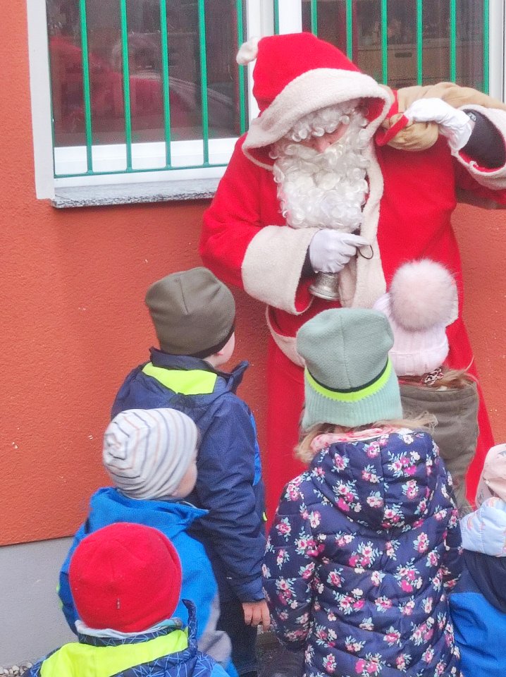 „Vorfreude, schönste Freude. Freude im Advent.“ – So heißt es schon in einem altbekannten Weihnachtslied. Denn die Kinder lieben die Zeit, in der sie Adventstürchen öffnen dürfen und in gespannter Erwartung auf den Weihnachtsmann sind. Neben dem Adventskalender haben wir auch in diesem Jahr einen Adventskranz. Auf diesem befinden sich vier Kerzen und viele tolle Dinge aus Naturmaterialien, welche unsere Kinder im Wald gefunden haben. Mit Spannung verfolgen die Kinder auch das heilige Abenteuer von Maria und Josef in der Adventszeit. Heute wurde mit Spannung der Weihnachtsmann erwartet. Als er nun in diesem Jahr die Kinder im Garten mit einem großen Sack überraschte war die Freude groß. Viele Fragen wurden von den Kindern an den Weihnachtsmann gerichtet, aber auch mit Liedern und Gedichten wurde er überrascht. Nachdem der Weihnachtsmann weiter zu den anderen Kindern gefahren ist, durften die Kinder in Ihre Gruppenräume um die Geschenke auszupacken. Die leuchtenden Kinderaugen waren das schönste Geschenk für die Erzieherin. Allerlei Pfefferkuchen, Stollen und Kinderpunsch rundeten den Vormittag ab.