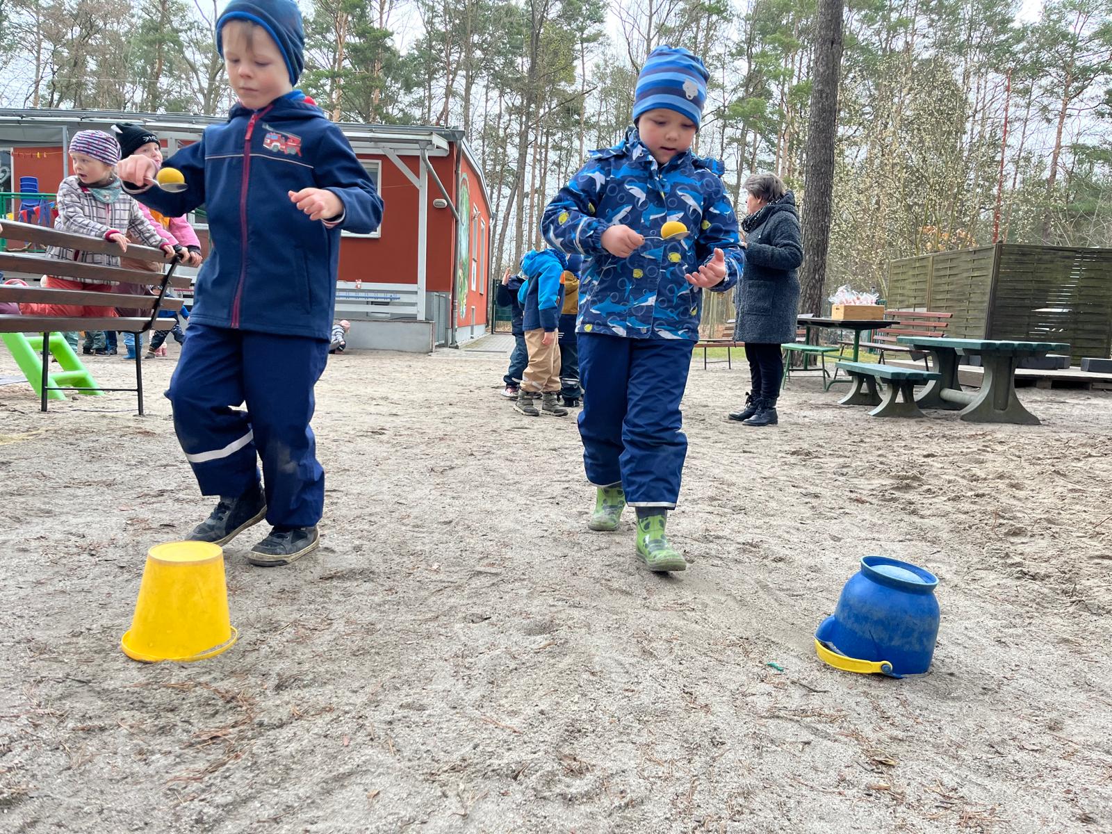 Im Anschluss konnten sich die Kinder an verschiedenen Spielstationen im Garten ausprobieren. Beim Eierlauf war Geschicklichkeit gefragt, bei den Wurfspielen/ Waleien stand der Spaß im Vordergrund und beim Steckenpferd-Parcours konnten die Kinder selbst aktiv werden und sich bewegen. Überall wurde gelacht, ausprobiert und gemeinsam gespielt.