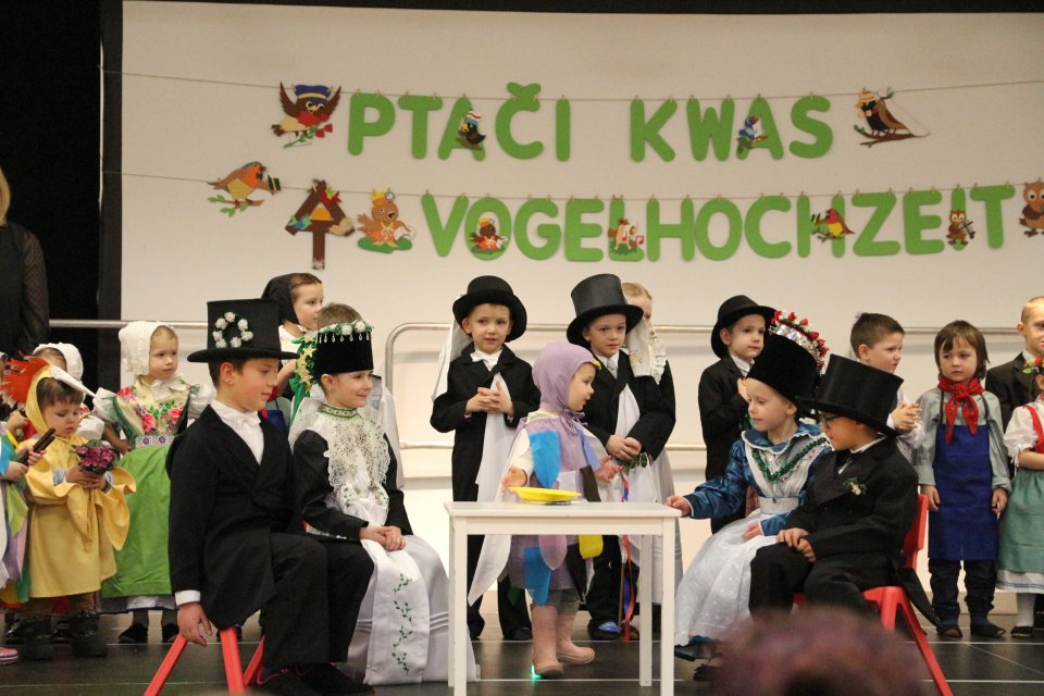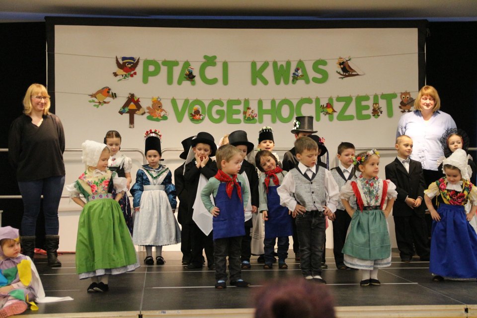 Am 6. Februar war es endlich so weit: In der Aula der Paulus-Schule in Königswartha wurde die Vogelhochzeit gefeiert. Eltern, Geschwister und Großeltern waren zahlreich gekommen, vor vollen Zuschauerplätzen führten die Mädchen und Jungen unserer Kita mit viel Freude ihr buntes Programm zur Vogelhochzeit auf.